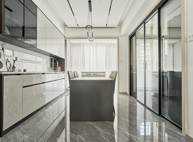 餐桌島臺設(shè)計,可以做西餐,下方是儲物柜,可以放家用小電器,島臺側(cè)面裝了軌道插座,