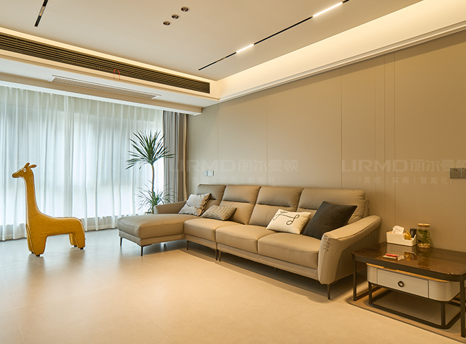 整墻做電視背景懸浮柜,整體灰色系基調(diào)搭配無主燈設(shè)計(jì),線性燈帶營造滿滿高級(jí)感。