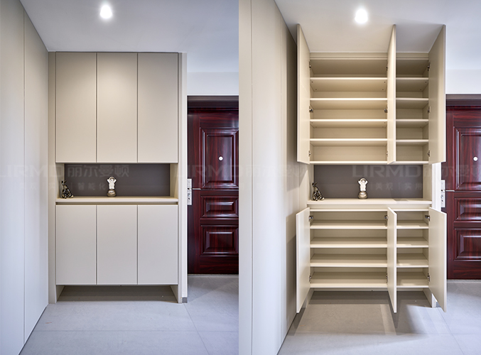 18mm厚杉木芯板,大大提升了收納空間,鞋柜下方懸空設計,可以放置鞋子,