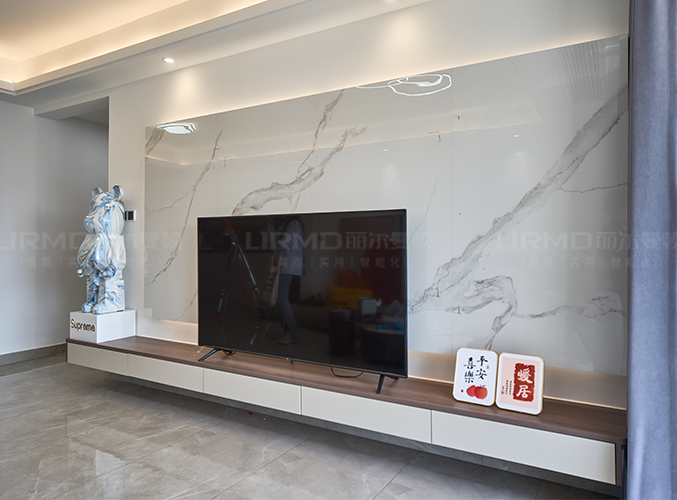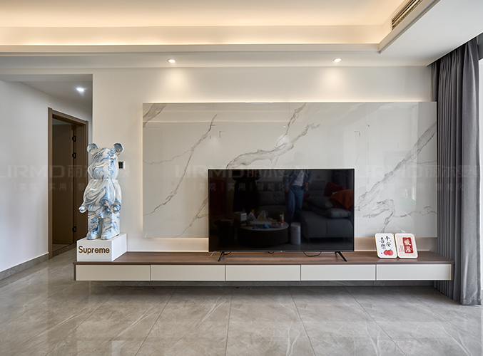 整屋通鋪瓷磚,盡顯大氣,電視懸浮柜下方留有掃地機器人位置,方便打掃無死角。