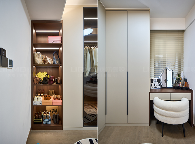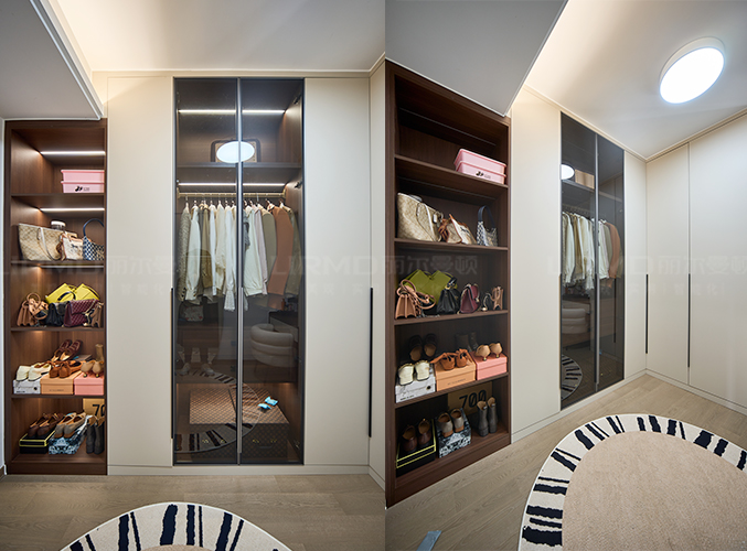 衣帽間分為三個區域,梳妝區、掛衣區、包包區、搭配玻璃柜門,更加時尚。