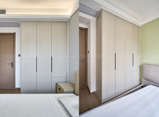 臥室衣柜和墻漆搭配盡顯高級,三葉門衣柜,床頭位置做分段柜門,讓空間合理利用。