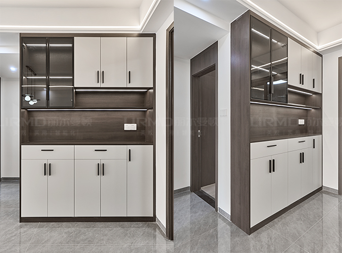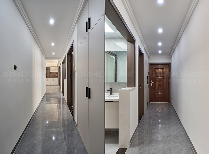 入戶是一條很長(zhǎng)的走道,玄關(guān)位置做開放格設(shè)計(jì),下方懸空設(shè)計(jì),好放置鞋子,