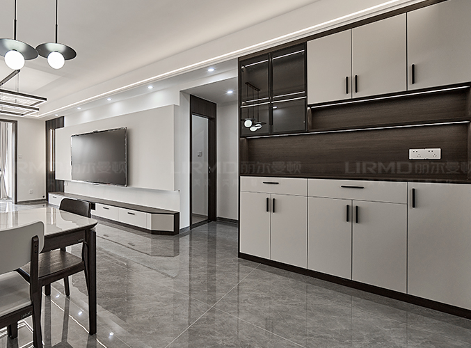 象牙灰柜門搭配煙熏尤加利柜體,整體不失單調(diào),中間部分做雙層設(shè)計(jì),