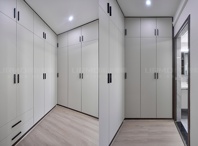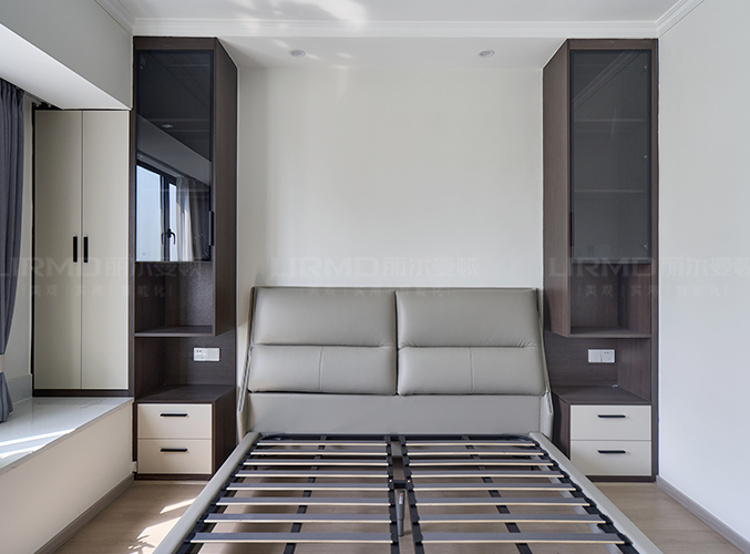 主臥兩側(cè)定制床頭柜,柜體延伸至頂端,充分利用空間,側(cè)面做一個(gè)L型的衣帽間,