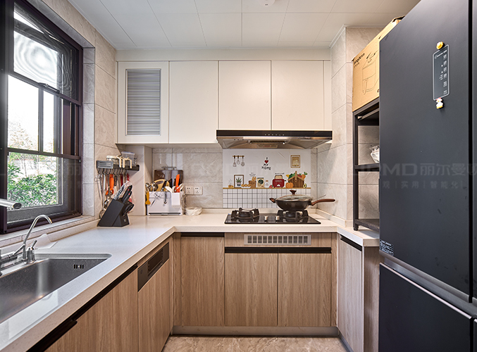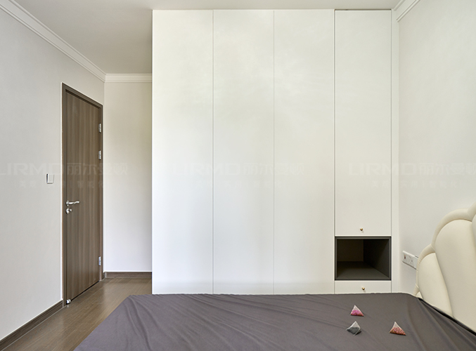 白色答題時(shí)搭配木紋柜子,暖色燈光讓氛圍溫馨清爽。