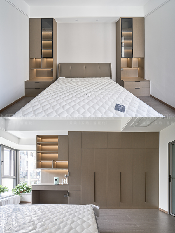 主臥衣柜、主臥梳妝臺(tái)、主臥化妝品收納柜、兩個(gè)主臥到頂床頭柜、次臥衣柜、以及同色墻板、同色到頂房門)