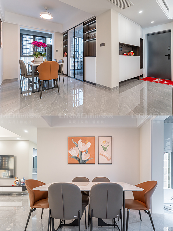 全屋1500×750柔光瓷磚,整體通透大氣,清潔方便,一字柜搭配玻璃柜,更得輕盈通透,滿滿的高級感