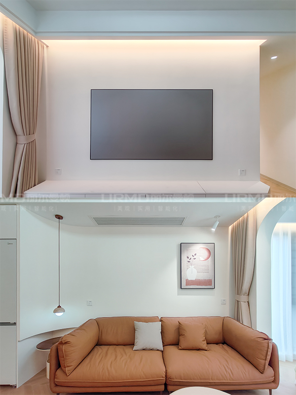 一字型懸浮電視柜,右邊切割設計不容易碰撞,大面積留白,簡單耐看
