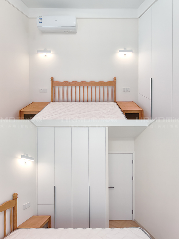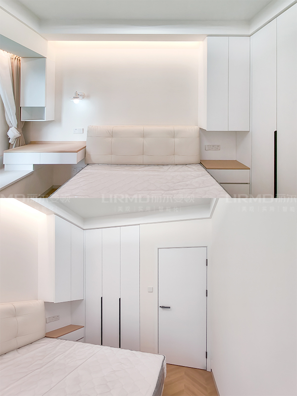 臥室一側從飄窗延伸打造床頭柜,床頭柜與背景墻材質一致視覺上看起來簡單又舒適