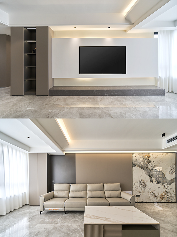 門墻柜一體化,柜子濟州灰與木卡其的搭配為整個空間的主色調,地面磚的大理石灰為基礎色調